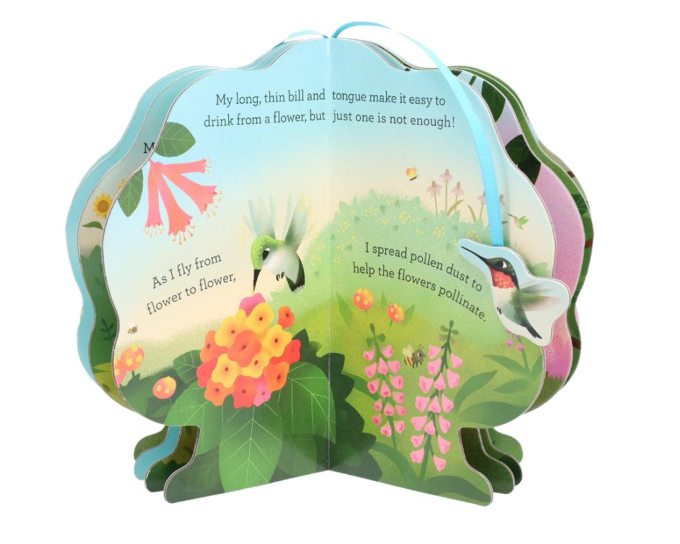 Zip from flower to flower with a pair of hummingbirds in this ingenious board book that stands up to transform into a tree! The youngest nature lovers will adore this clever interactive board book! Simply fly the two hummingbird characters-attached to the board book with ribbons-through the beautifully illustrated pages to hover over flowers, sip sweet nectar, and build a cozy nest for their eggs. Full of playful and informative touches, this book is a sweet introduction to these bright and irresistibly appealing little birds. Click the image below to order from Chronicle Books!